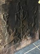 ANTIEKE FRANSE HAARDPLAAT Grote antieke haardplaat met prachtige details die tot leven komen als de haard brand engelen en sfinxen 80x80cm 595 euro