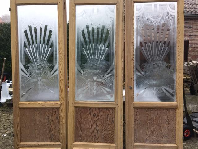 ART DECO DEUREN UIT PARIJS CAFE 3 SLAG MET PRACHTIG GEETST GLAS MATEN CA: 247CM HOOG - 80CM BREED (3)